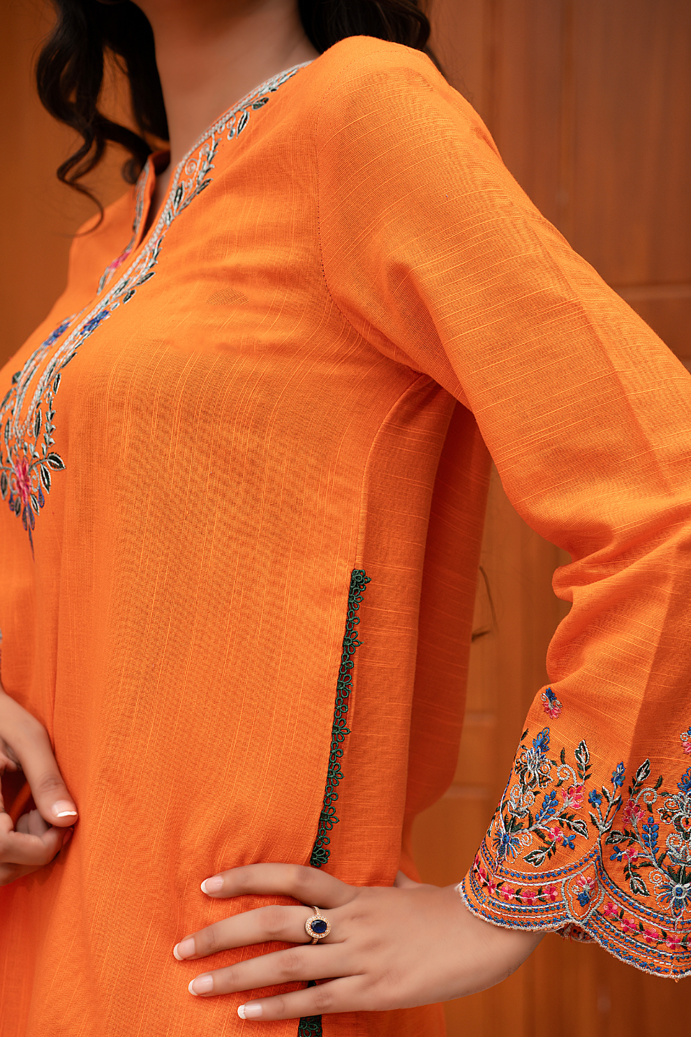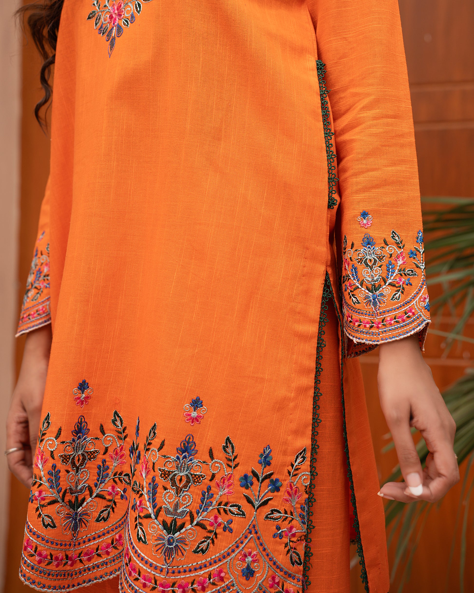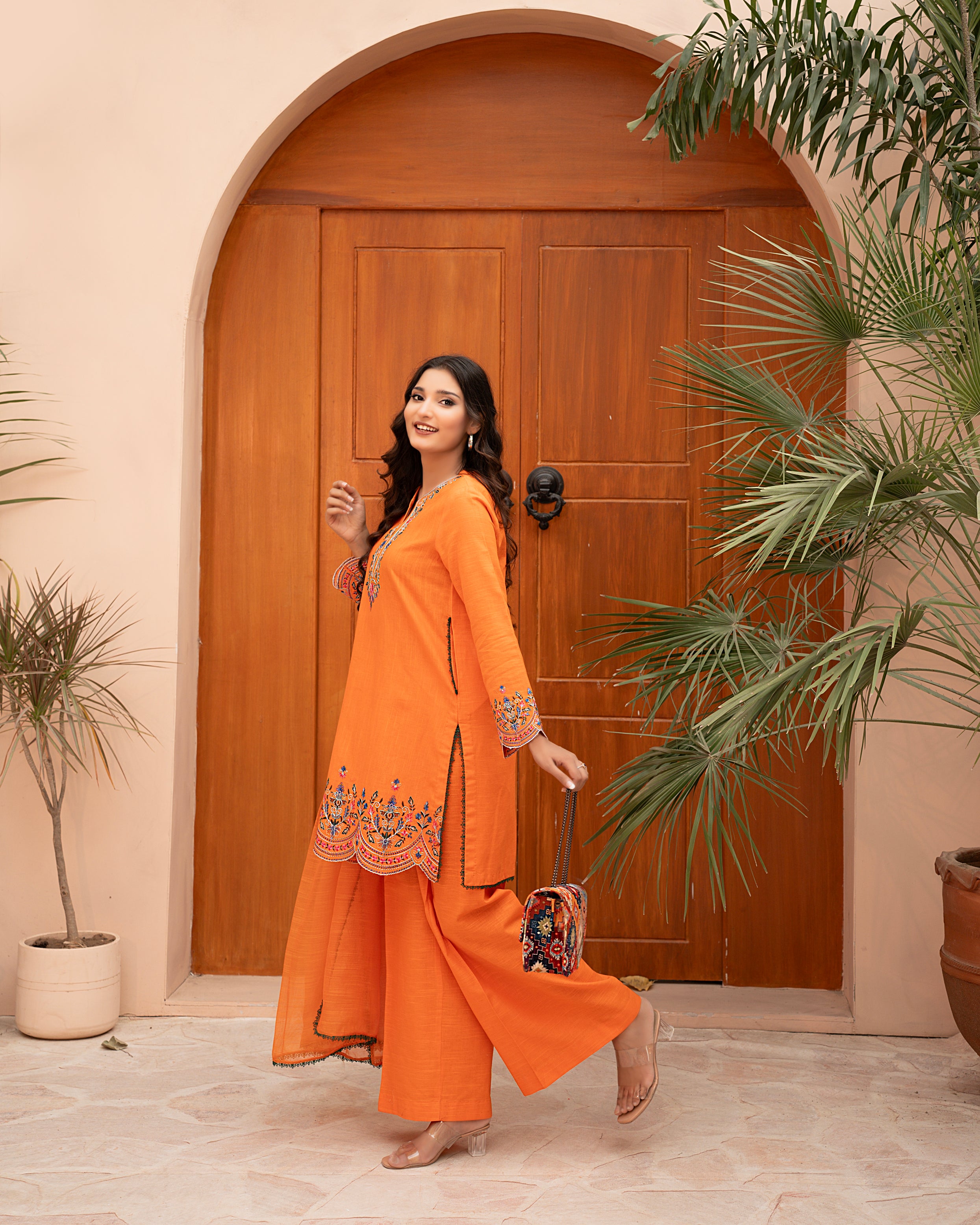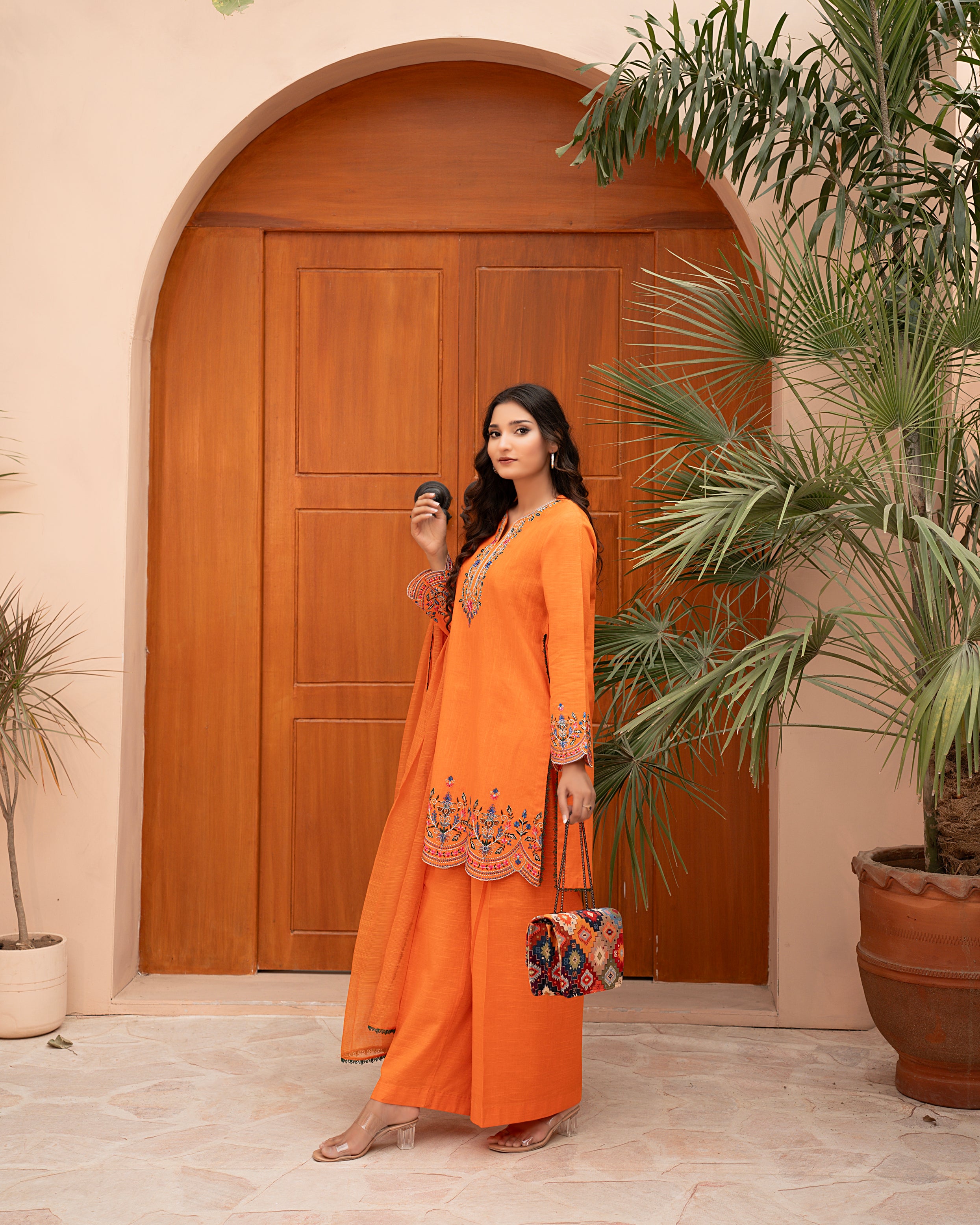 Step into the warmth of winter with “Amber Glow” — a beautifully embroidered orange Khaddar 3-piece suit from Mina Muse’s Winter Bloom Collection. Crafted for both comfort and style, this ensemble captures the brilliance of sunset hues through intricate threadwork and a premium winter fabric finish.