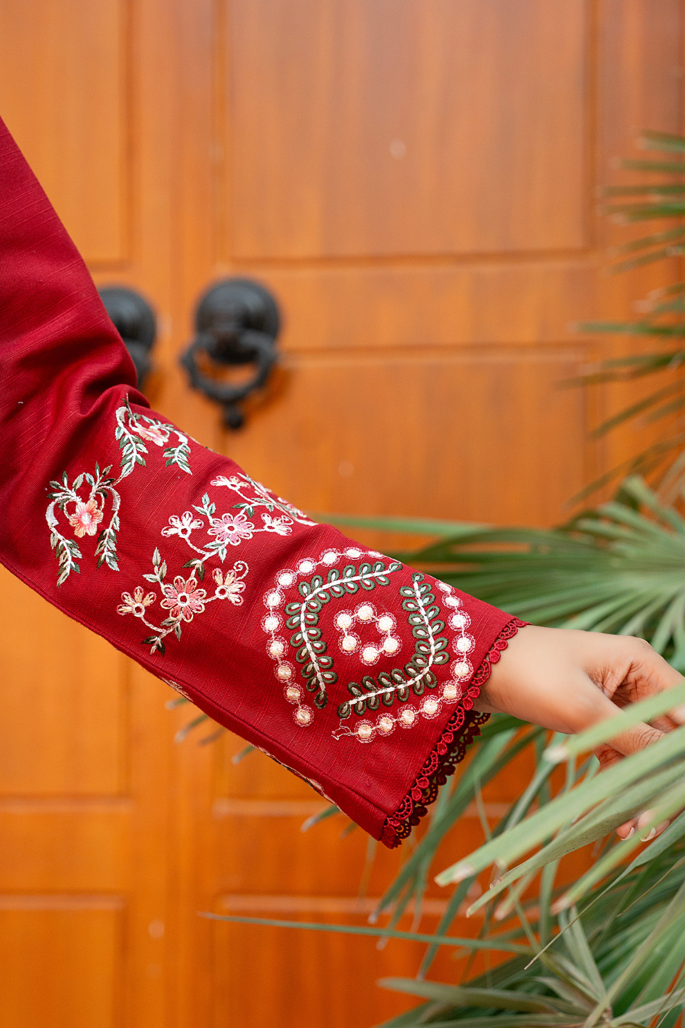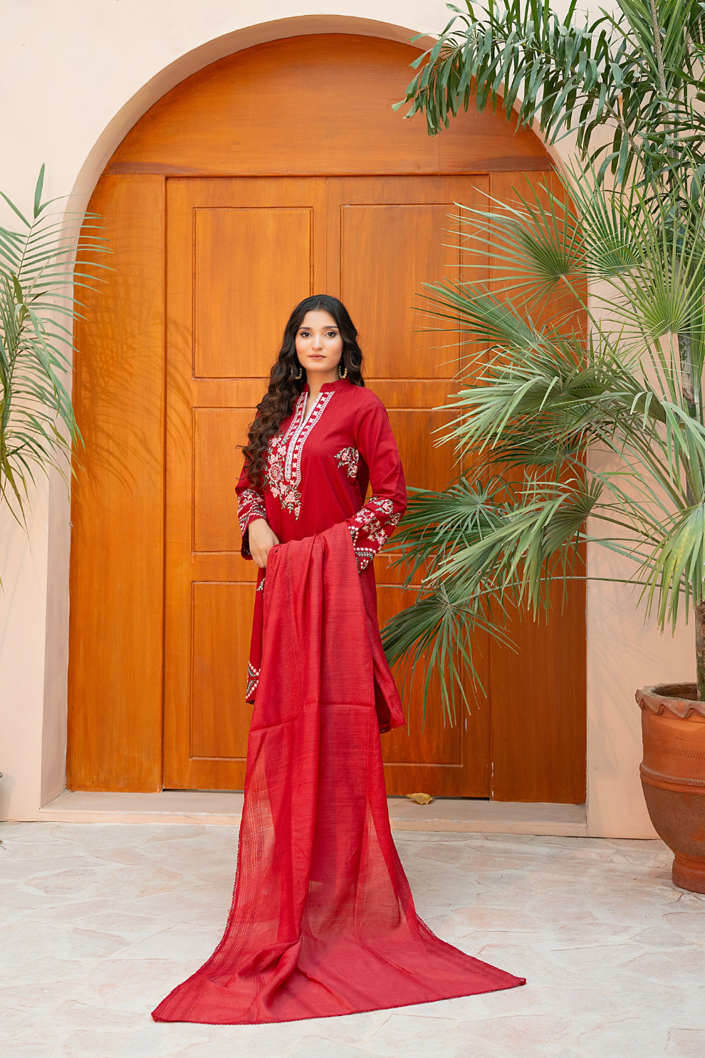 Embrace timeless sophistication with “Garnet Grace” — a deep maroon embroidered Khaddar ensemble from Mina Muse’s Winter Bloom Collection. Crafted with elegance and comfort in mind, this 3-piece suit radiates warmth and refinement, featuring exquisite embroidery and a regal color palette that beautifully complements the winter season.