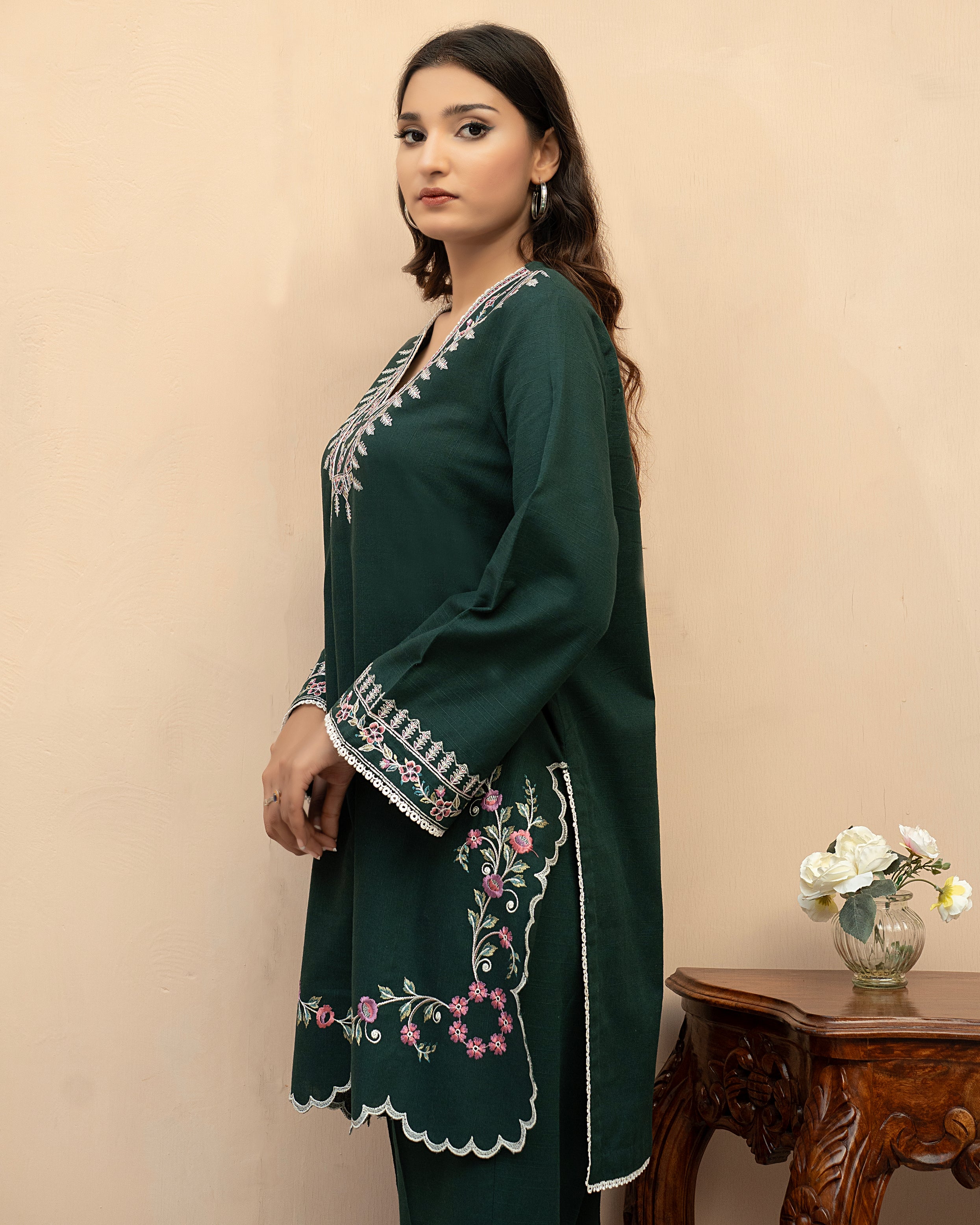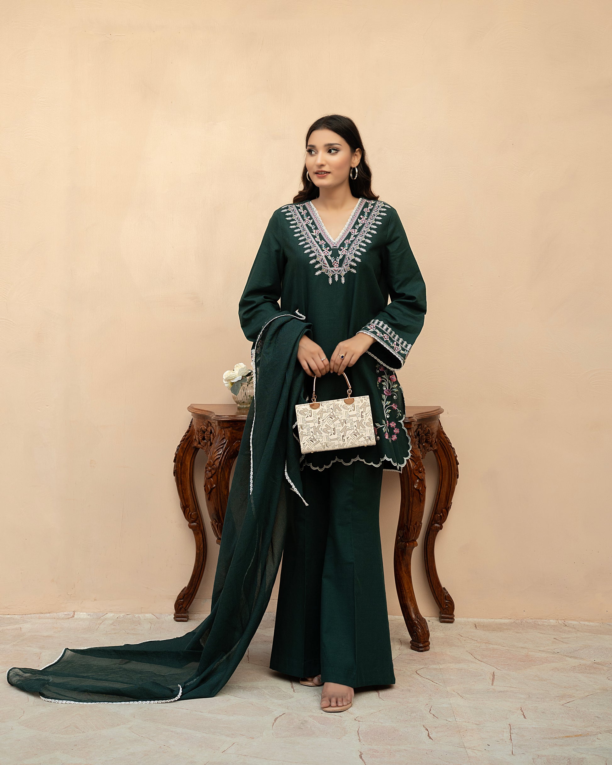 Bring freshness to winter days with “Mystic Meadow” — a stunning embroidered green Khaddar ensemble from Mina Muse’s Winter Bloom Collection. Designed for elegance and warmth, this 3-piece suit combines soft winter fabric with intricate thread embroidery, creating a refined statement of timeless beauty and sophistication.
